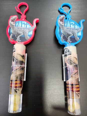 Tubo de doces (feijões) dos dinossauros do Jurassic World. A tampa do tubo é também um porta chaves.