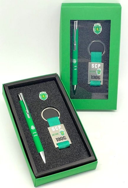 Conjunto de esferográfica, pin e porta chaves do Sporting Clube de Portugal para os fãs do clube.
