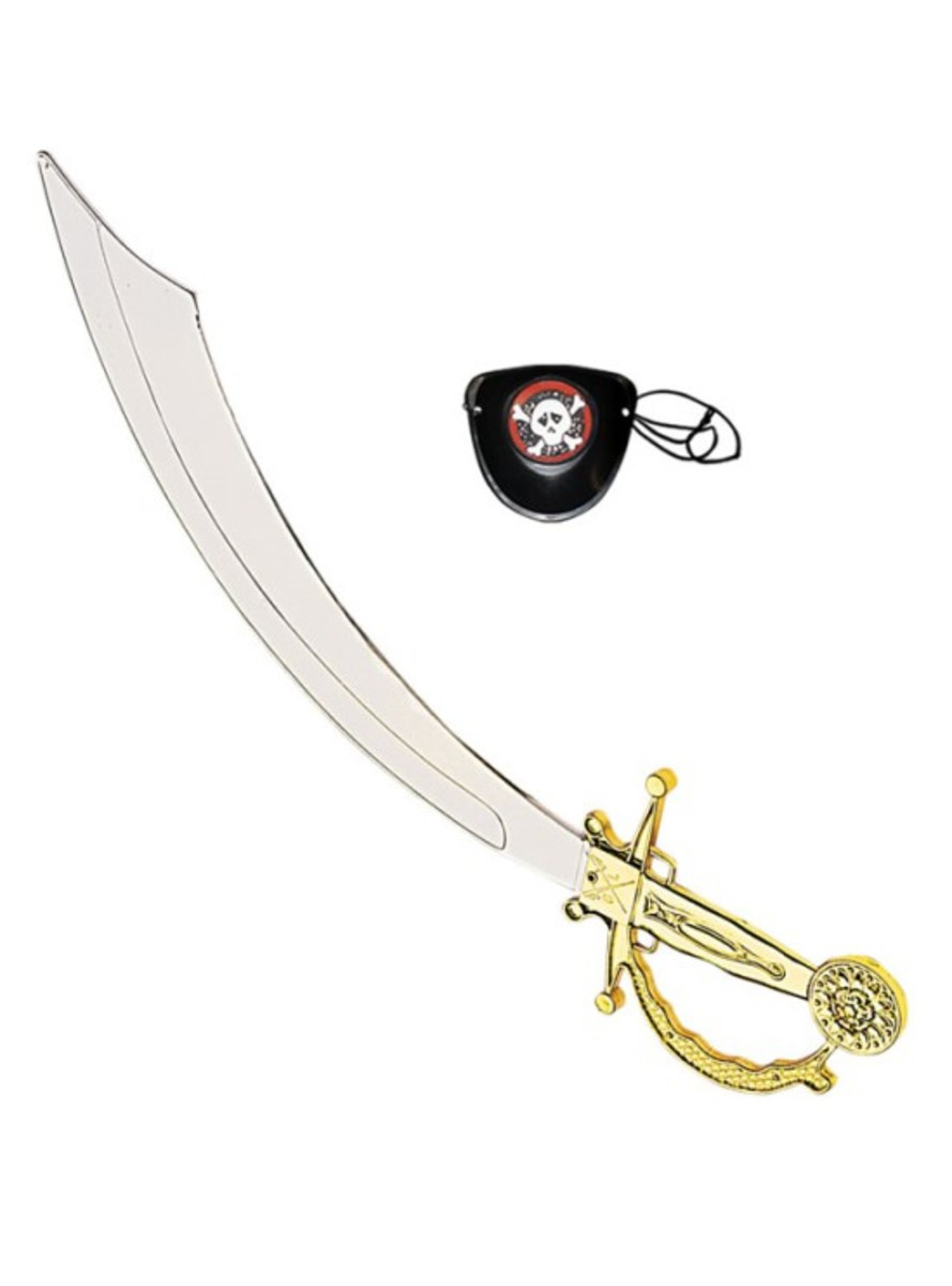 Espada de pirata cinzenta com aproximadamente 46cm, acompanhada por uma pala preta de plástico que se segura com um elástico e que contém um símbolo de pirata. O conjunto é em plástico, mas o cabo é rígido com uma argola e uma pega dourada.
