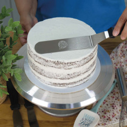 Espátula curva com lamina em aço inoxidavel e cabo de plástico para trabalhos em pastelaria ou cozinha.
