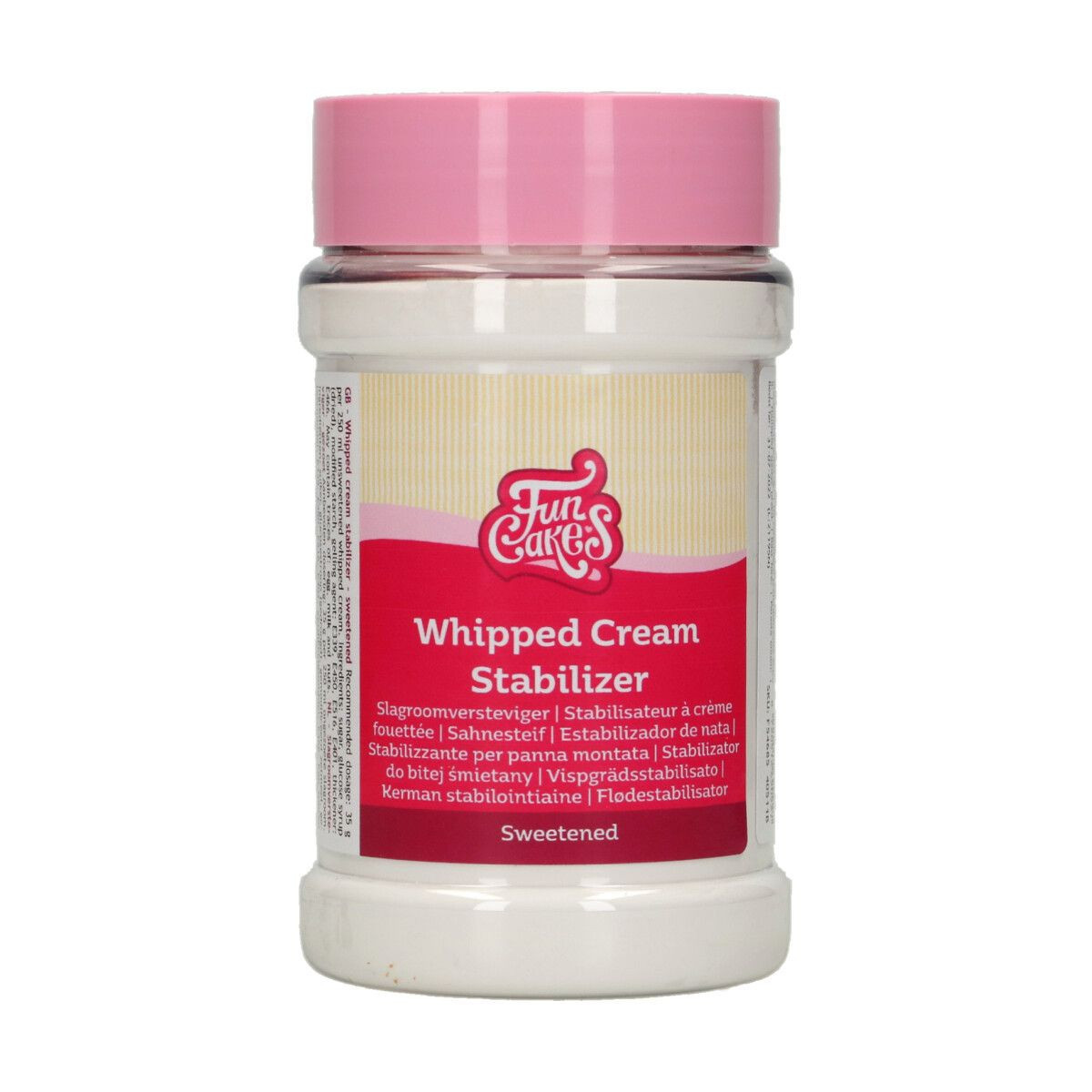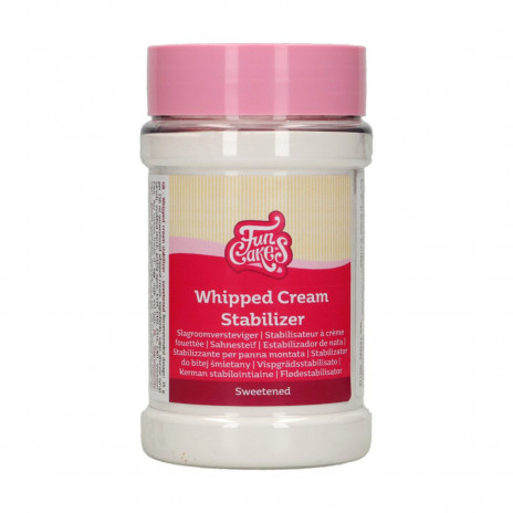 O FunCakes Whipped Cream Stabilizer é um pó estabilizador adoçado que mantém o chantilly firme e rígido o suficiente para a cobertura. Não é necessário adicionar açúcar.