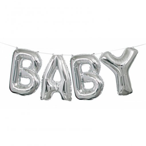 Grinalda com a palavra baby em tom prateado para festas de aniversário ou baby showers.