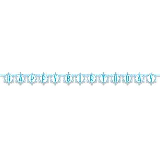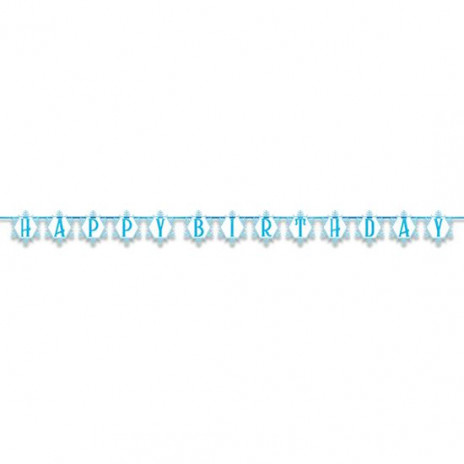Grinalda para festas de aniversário do tema princesas de inverno ou para festas de aniversário da Frozen com a inscrição "Happy Birthday".