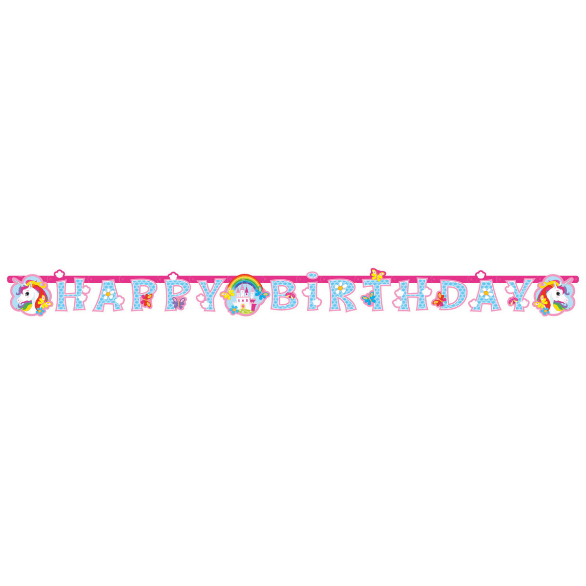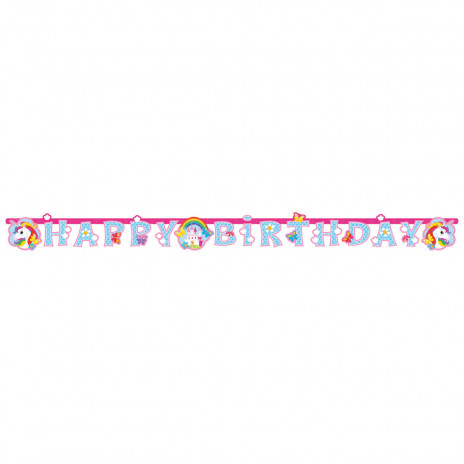 Grinalda de tamanho grande para festas de aniversário com o tema Unicórnio nos tons verde rosa.