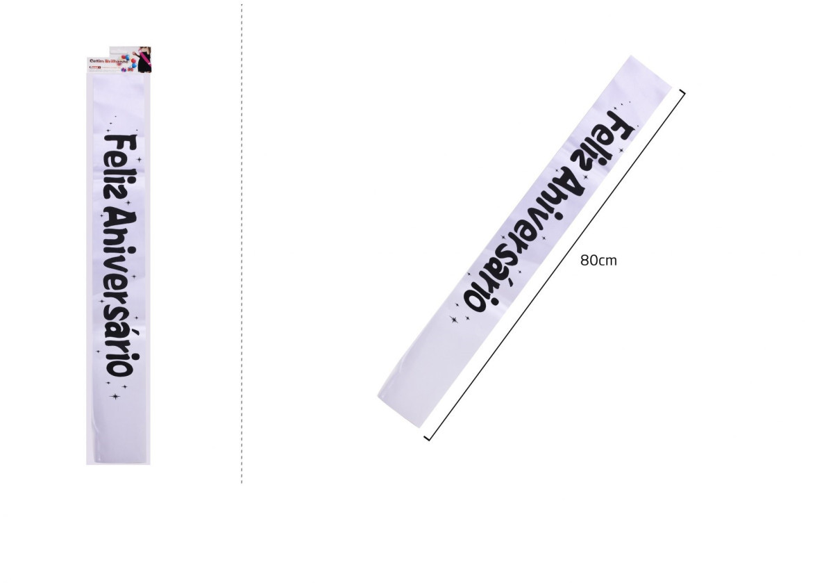 Para a tua festa de aniversário, uma faixa na cor branca com a inscrição "Feliz Aniversário".
