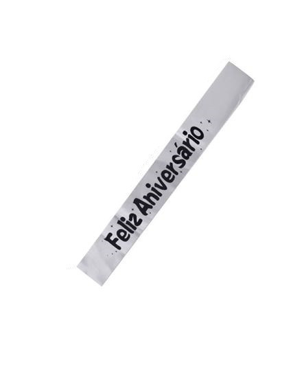 Para a tua festa de aniversário, uma faixa na cor prateada com a inscrição "Feliz Aniversário".