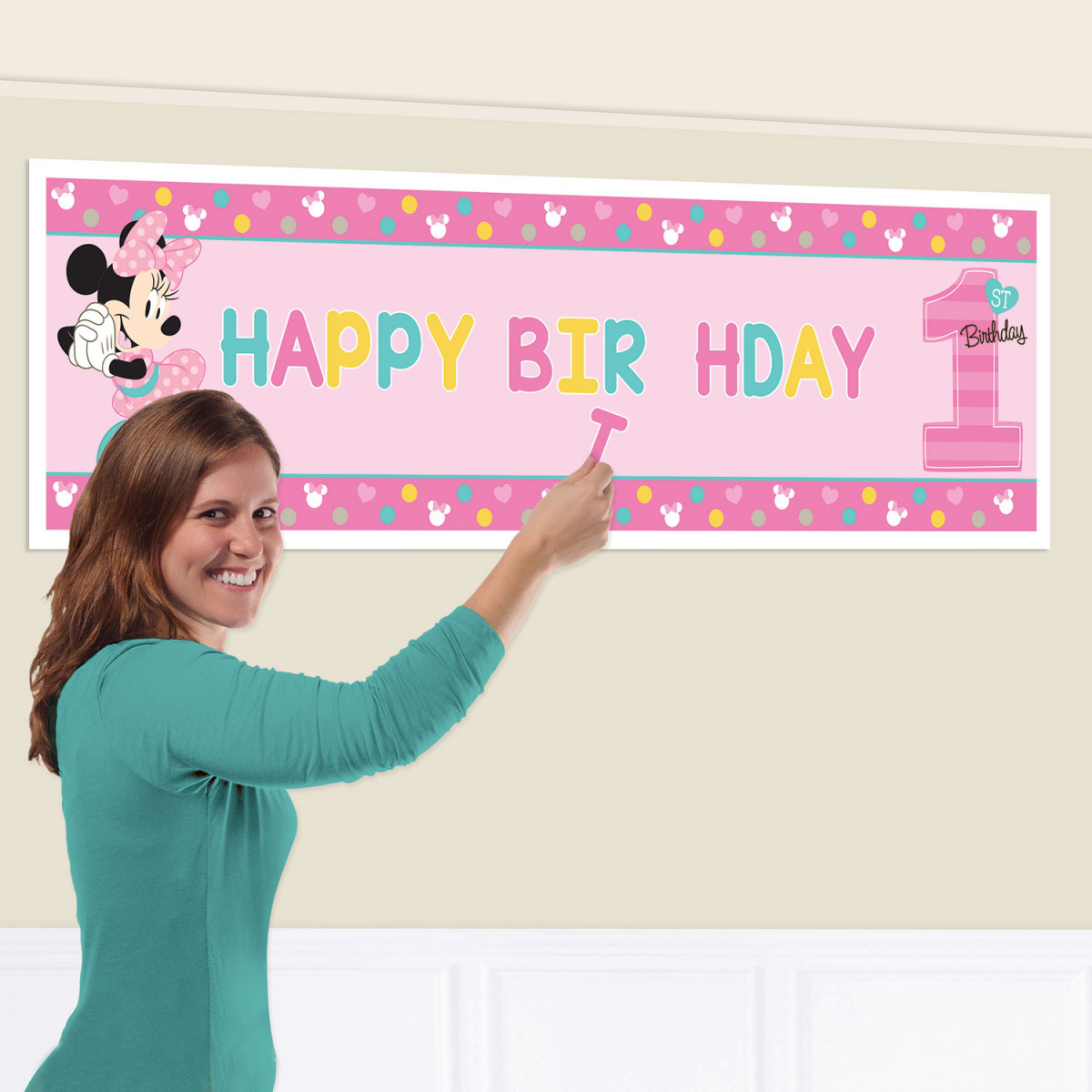 Banner gigante personalizável da Minnie 1ºAniversário com as medidas 165.1x50.8cm.