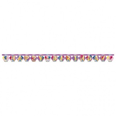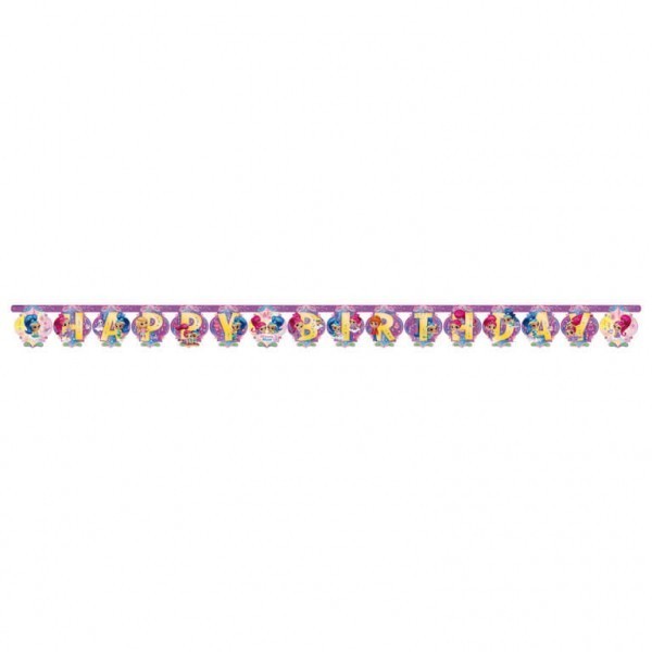 Decora a tua festa de aniversário Shimmer e Shine com esta grinalda de 2 metros de comprimento com a inscrição «Happy Birthday».