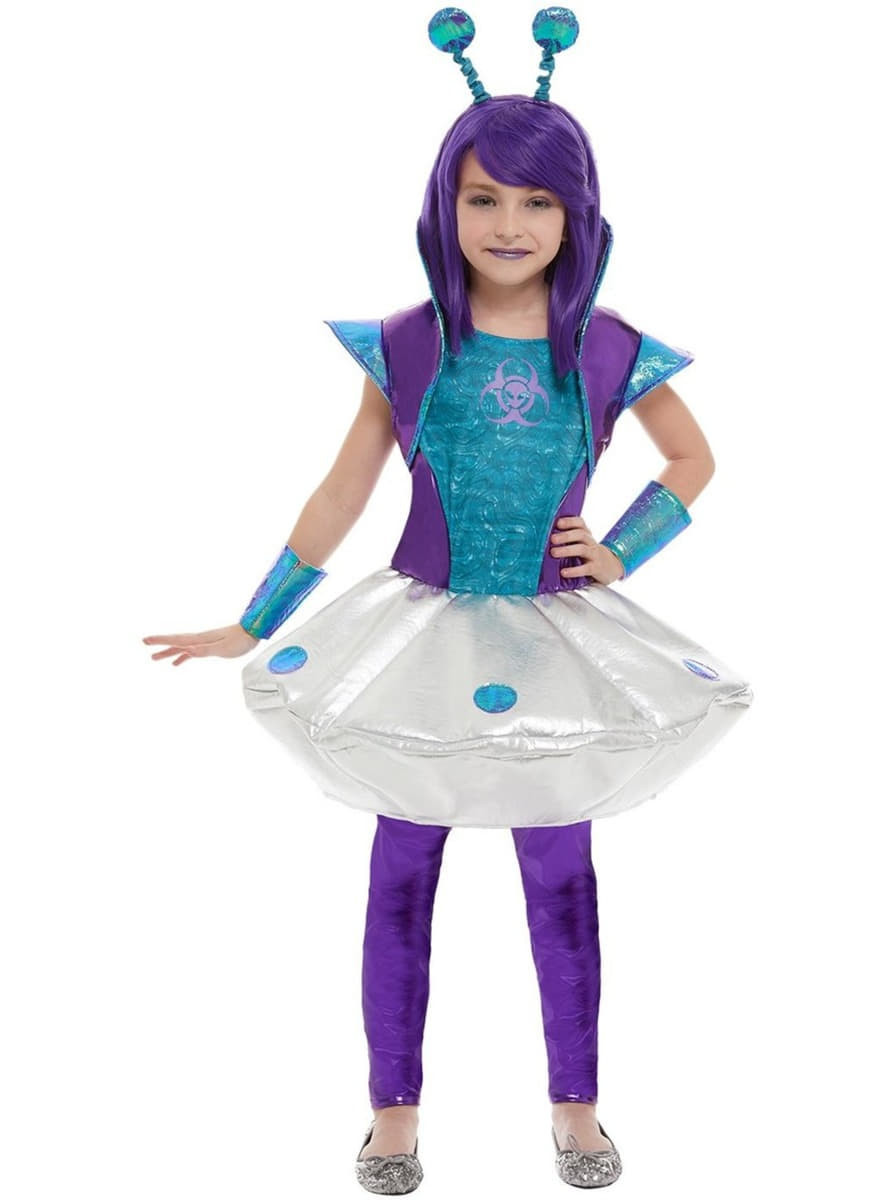 Disfarce de alien nave espacial para menina em azul e roxo para a sua criança se mascarar no carnaval.