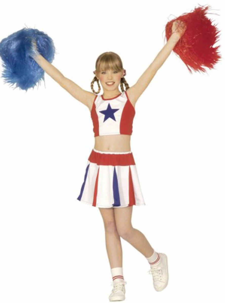 Disfarce de carnaval para menina de animadora em tons de branco, vermelho e azul.