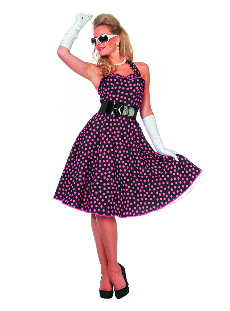 Fato de Carnaval para mulher de anos 50. Inclui vestido preto às bolinhas cor de rosa e cinto preto. Não inclui colar, óculos, luvas nem sapatos.