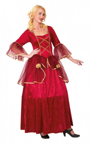 Elegante vestido de baronesa sec. XVIII, para o baile mais popular da corte. Desfile com classe com este traje nobre. Fato de Carnaval histórico de manga comprida no tom de bordô aveludado com saiote, para adulto. As extremidades das mangas são costuradas com tecido organza transparente e decoradas com um acabamento bordado dourado. Tem um fecho de abertura na parte das costas.