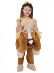 Disfarce de carnaval da Princesa Bela da Disney incorporado com um cavalo.
