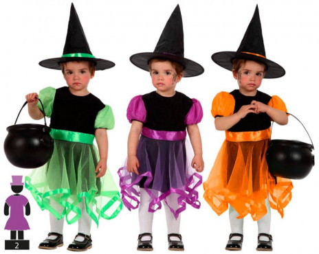 Fato de bruxa para bebé para festejar o halloween ou o carnaval. Disponível em três cores sortidas.