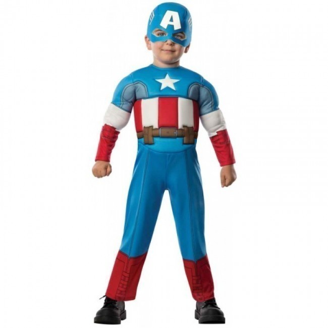 Este disfarce para o Carnaval dos vingadores capitão américa, inclui um bravo e musculado macacão azul com listas vermelhas e brancas e uma estrela branca no peito , juntamente com uma máscara com um A na frente.