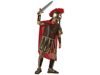 Traje de soldado romano para criança, inclui uma túnica, uma capa e alguns engenhos.