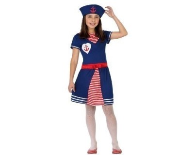 Traje de Carnaval azul de menina marinheira com âncora vermelha para meninas de vários tamanhos. Inclui vestido e chapéu.