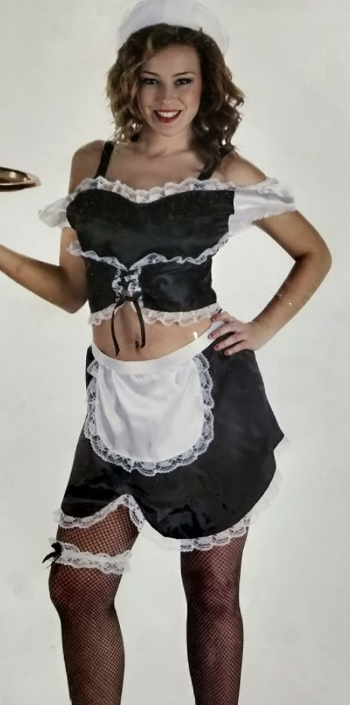 fato de criadinha sexy, que inclui top, saia, mini avental e bandoulete.