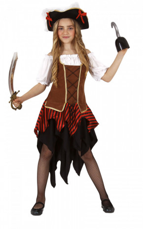Navegue em alto mar, encontre grandes tesouros e parta na aventura do disfarce de Carnaval de pirata para menina. É composto por vestido com fecho de abertura nas costas. Tem tons de castanho e dourado na parte frontal, a saia vem recortada em tons de vermelho e preto, criando um ar mais rebelde. Contém chapéu, poderá ser um pouco diferente do da imagem.