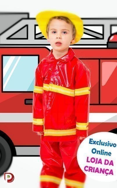 Fato de bombeiro para criança de alta qualidade, muito real, em tecido semelhante aos utilizados nas fardas dos bombeiros e impermeável.