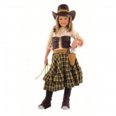 Fato de vaqueira cowgirl. Inclui camisa, corpete, saia, tapa botas, chapéu, e cinto com coldre. Disponível nos tamanhos 3-5 anos, 5-7 anos, 7-9 anos, 9-11 anos, 11-13 anos.