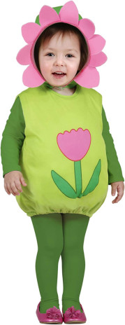 Disfarce para criança de flor em verde com pétalas na cabeça.