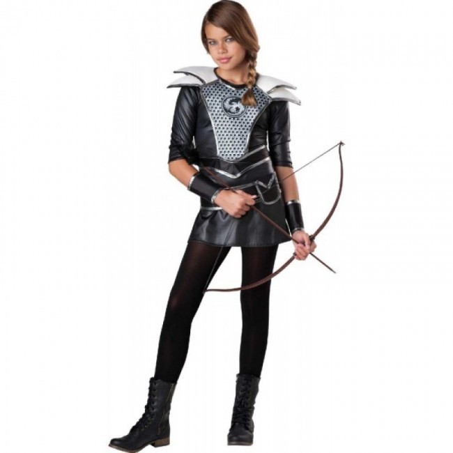 Disfarce para o Carnaval de guerreira da Katniss do filme Hunger Games num conjunto de vestido preto e prata, pulseiras e um cinto em preto, uma roupa muito semelhante usado por Katniss Everdeen.
