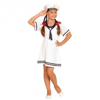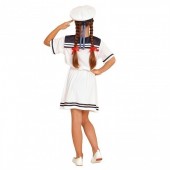 Este disfarce para o Carnaval de marinheiro menina consiste num vestido branco com pormenores em azul como na gola, no símbolo que está do lado esquerdo, no peito, no lenço e nas faixas que estão em redor da manga e da saia. Não inclui sabrinas.