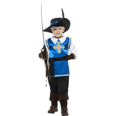 Disfarce de carnaval para criança de mosqueteiro em azul.