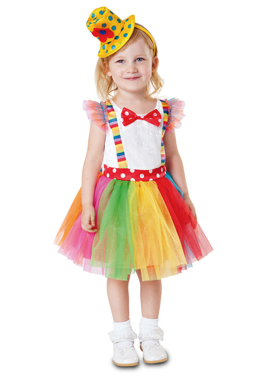 Fato menina Palhaça. Inclui vestido com vários tules coloridos, corpete branco, com alças fingidas às riscas, Bandolete com chapéu