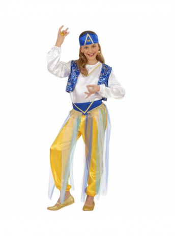 Inclui: camisa branca, colete azul com padrão a branco, calças amarelas com véus, cinto e adorno de cabelo em azul