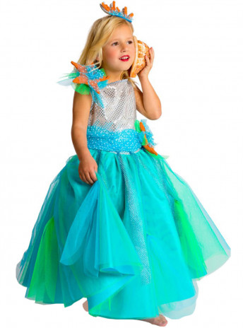Disfarce de Carnaval da princesa dos mares composto um bonito vestido com parte superior em tom prateado fundo em vários tons de azul e verde. Destaque para alguns apontamentos em tom laranja na zona do ombro e cintura a condizer com a coroa