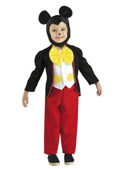 Fato, disfarce de Carnaval de rato para menino. É composto por colete branco com bolinhas e laço amarelo, calças vermelhas, casaco preto de manga comprida e adereço para a cabeça com as orelhas de rato.