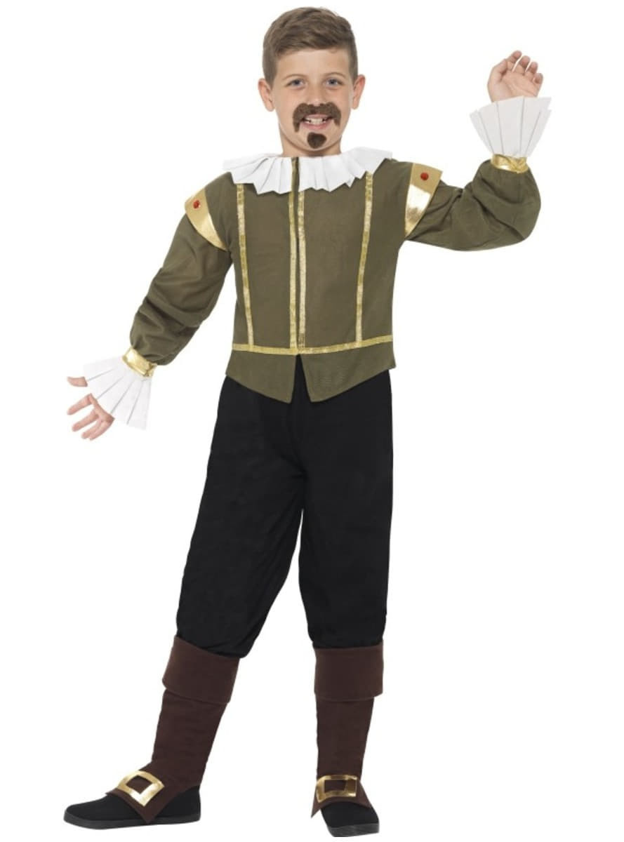 Fato para a sua criança se mascarar de Shakespeare, o grande poeta, dramaturgo e ator inglês.