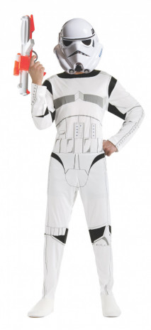 Fato de Carnaval com o soldado Stormtrooper da saga Star Wars. O macacão é branco com riscas pretas e esverdeadas.