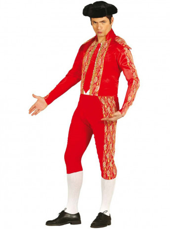 Fato de Carnaval de toureiro para adulto. É composto por corsário na cor vermelha com elástico na cintura, pequenos detalhes brancos e dourados pelo comprimento das calças, camisola de manga comprida com gravata e pequena abertura de velcro junto ao pescoço e ombros. Contém pequenos adereços nos ombros.