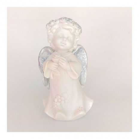 Figura de bolo para batizado de anjo em resina com flor nas mãos. Com pormenores em glitter prateado nas asas e na coroa.