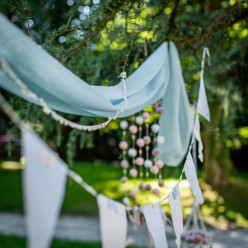 Fita para decoração de festas e/ou eventos com pompons em branco. Ideal para decoração de baby shower e caça sonhos.