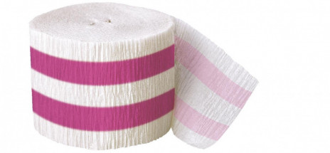 Papel branco e rosa, com medidas de aproximadamente 24 m de comprimento x 4 cm de largura.
