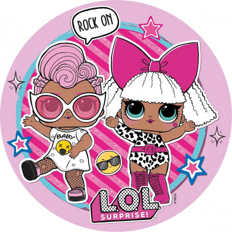 Disco de açúcar para decoração de bolo de aniversário com o tema LOL Surprise com cerca de 20cm de diâmetro. Sem glúten. Também disponivel em disco de hóstia ou obreia.