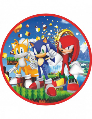 Disco de açúcar para decoração de bolo de aniversário do tema Sonic. Sem glúten. Também disponivel em disco de hóstia ou obreia.