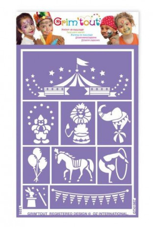 Acessório para pinturas faciais para festa com o tema de circo. Inclui uma folha de stencil em plástico para facilitar as pinturas. Esta folha de stencil da marca Grim'tout é reutilizável.