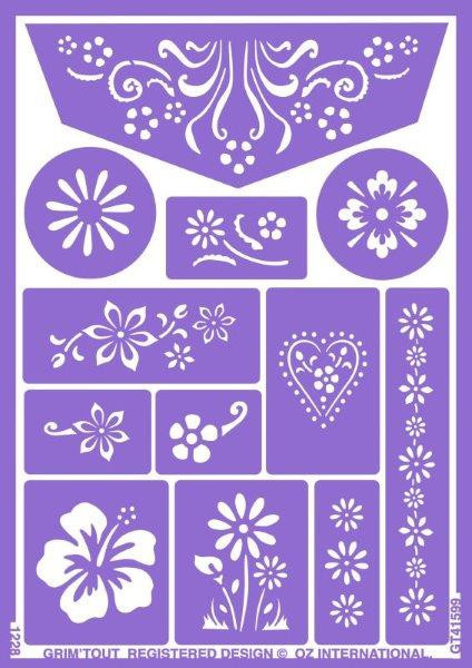 Acessório para pinturas faciais para festa com o tema de flores. Inclui uma folha de stencil em plástico para facilitar as pinturas. Esta folha de stencil da marca Grim'tout é reutilizável.