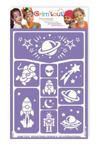 Acessório para pinturas faciais para festa com o tema de galáxia. Inclui uma folha de stencil em plástico para facilitar as pinturas. Esta folha de stencil da marca Grim'tout é reutilizável.