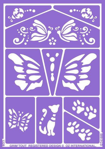 Acessório para pinturas faciais para festa de gatos e borboletas. Inclui uma folha de stencil em plástico para facilitar as pinturas. Esta folha de stencil da marca Grim'tout é reutilizável.
