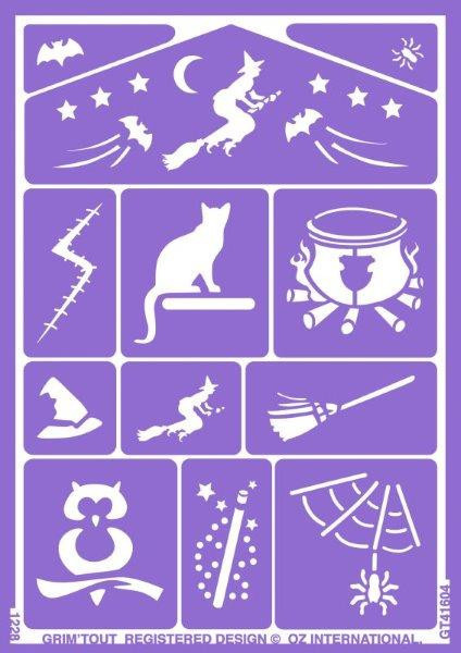 Acessório para pinturas faciais para festa com o tema de magia. Inclui uma folha de stencil em plástico para facilitar as pinturas. Esta folha de stencil da marca Grim'tout é reutilizável.