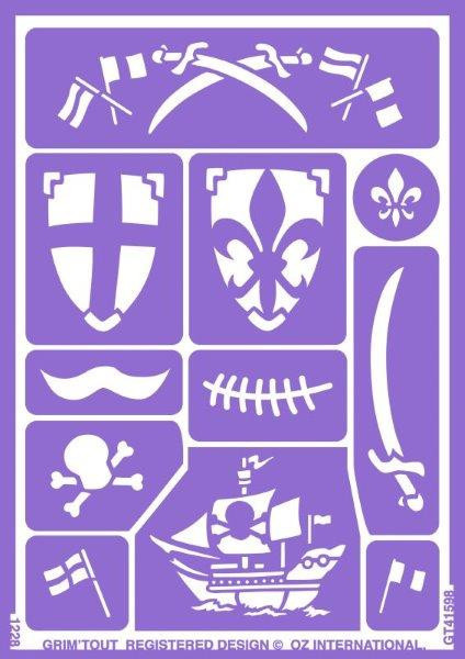 Acessório para pinturas faciais para festa com o tema de piratas. Inclui uma folha de stencil em plástico para facilitar as pinturas. Esta folha de stencil da marca Grim'tout é reutilizável.