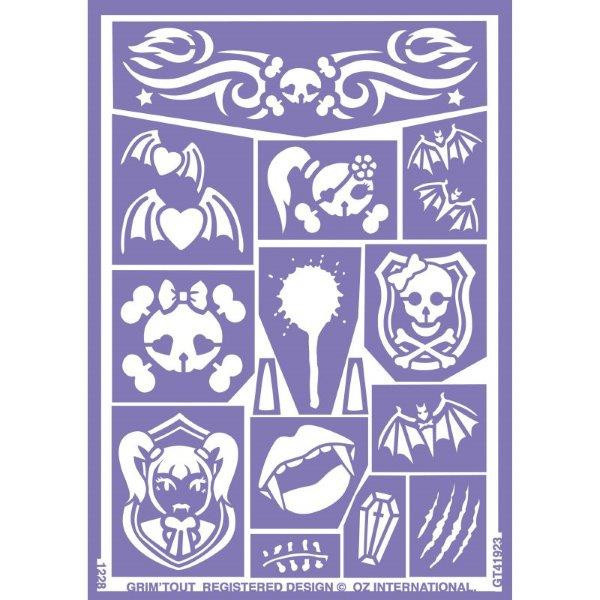 Acessório para pinturas faciais para festa com o tema de princesa drácula. Inclui uma folha de stencil em plástico para facilitar as pinturas. Esta folha de stencil da marca Grim'tout é reutilizável.