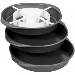 Este conjunto exclusivo de formas fará com que cada pedaço de bolo pareça uma obra de arte multicolorida. É simples e funcional. O anel separador divide facilmente a massa do bolo em diferentes secções da forma. Usando todas as 3 forminhas, pode criar 3 camadas.