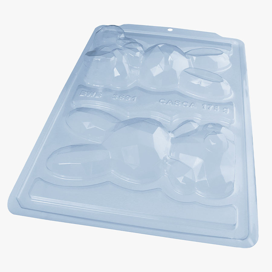 Molde acetato (3 partes), ideal para produção de chocolates com muito mais praticidade e precisão.